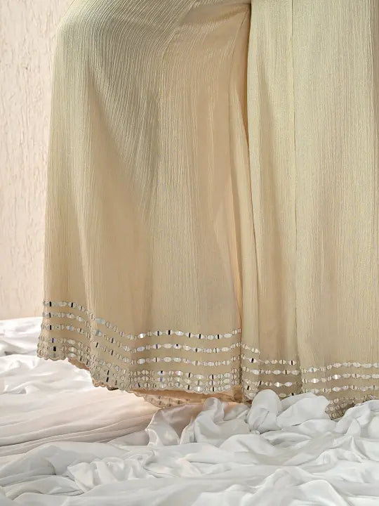 A delicate bloom of tradition and shimmer, this subtle golden glow set from Chhavi embodies quiet sophistication. The Chanderi silk kurta, designed with graceful 3/4th sleeves, is richly hand-embroidered with mirror work in floral motifs - each petal catching the light like morning dew. The crushed Chanderi silk bottoms, equally adorned, flows with soft volume and reflective charm. A gossamer silk organza dupatta drapes the look in ethereal lightness, completing this portrait of handcrafted elegance.