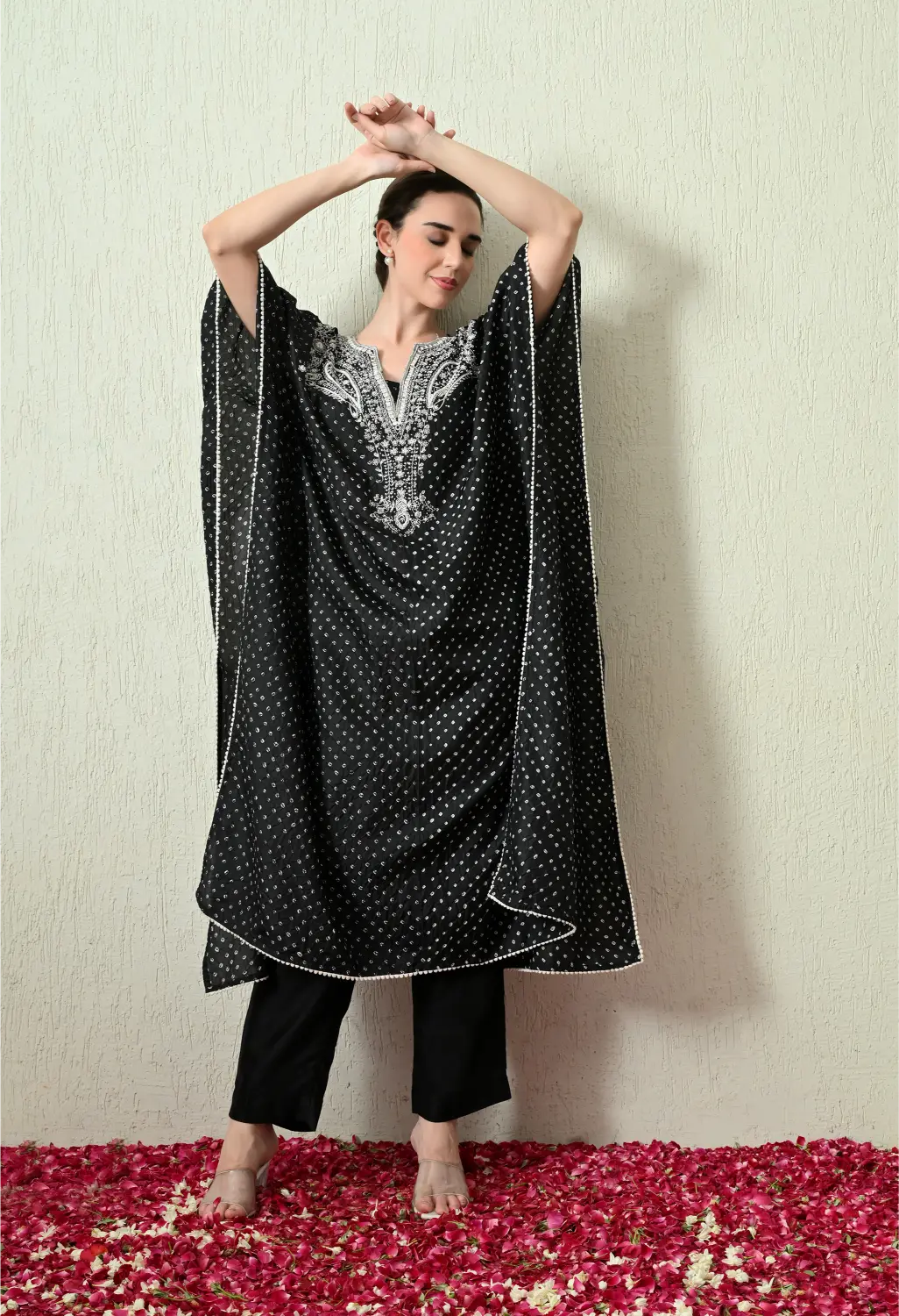 Elevate your festive wardrobe with this exquisite hand-embroidered kaftan set, crafted in pure Gajji Silk Bandhani. Rich in traditional charm, the fabric showcases vibrant tie-dye patterns unique to Bandhani art. Intricate hand embroidery adds depth and elegance, beautifully complemented by minimal white and silver zari work that lends a subtle shimmer. Perfect for celebratory occasions, this piece blends heritage craftsmanship with timeless style.