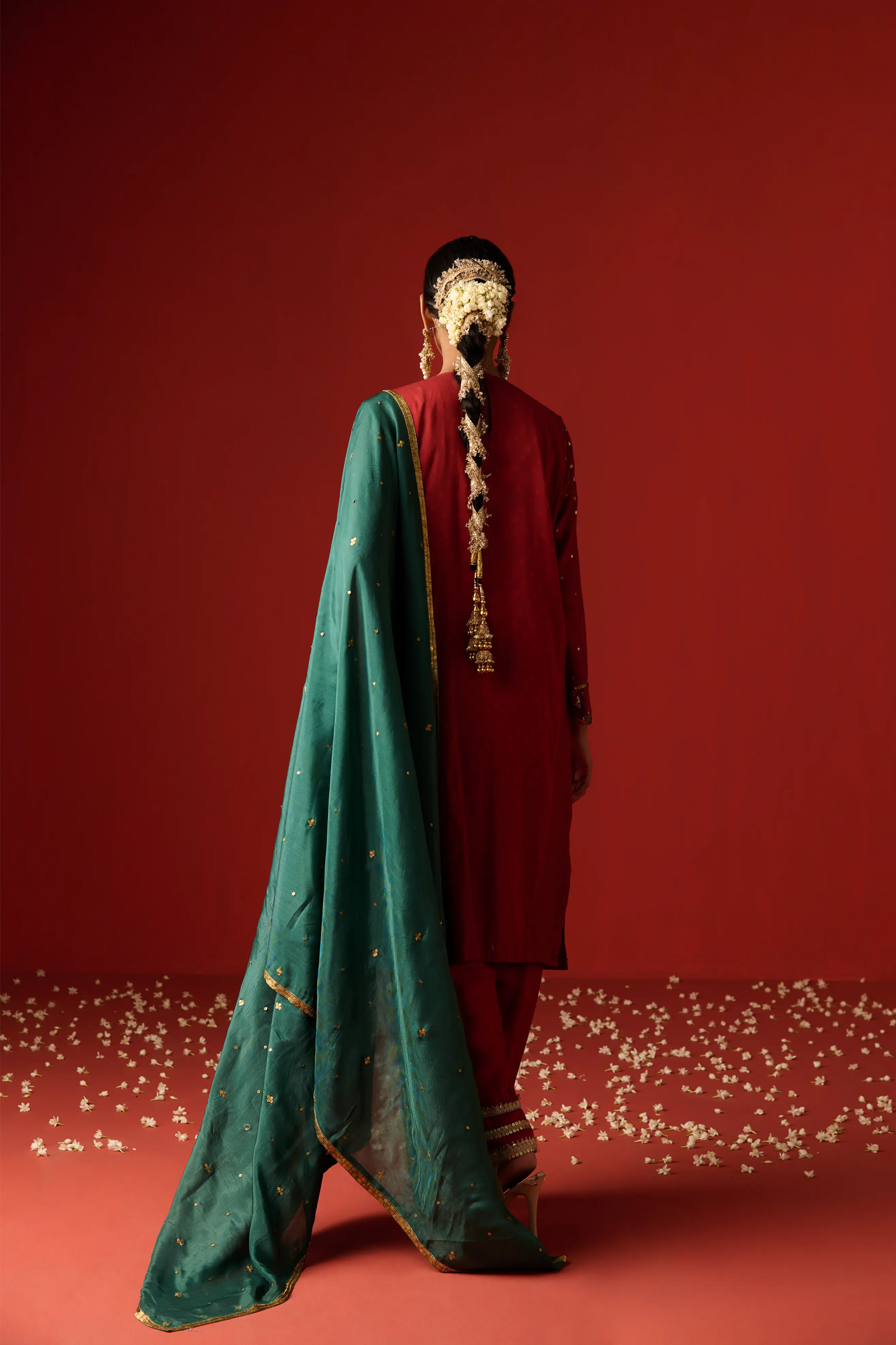 Featuring a maroon kurta in chanderi silk base with dabka, nakshi, zari thread and sequins hand embroidery, including bandhej print. It is paired with chanderi silk pants and an opara silk dupatta. Accentuate it with statement jewellery and heels for festive occasions or wedding ceremonies.