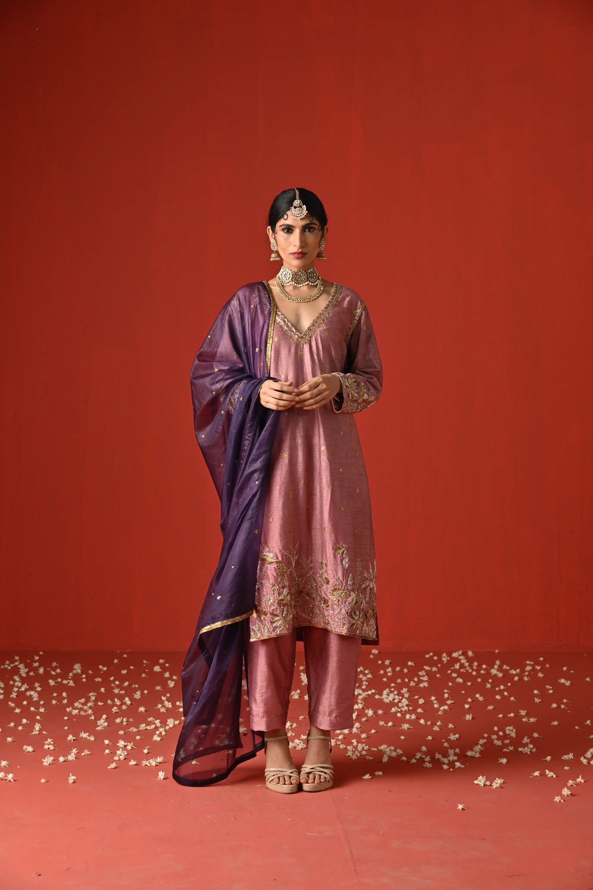 Featuring a pink kurta in raw silk base with dabka, nakshi, zari thread and sequins hand embroidery. It is paired with raw silk pants and an organza dupatta. Accentuate it with statement jewellery and heels for festive occasions or wedding ceremonies.